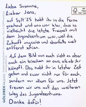 Diese Entscheidung ist dem Kirchenvorstand wahrlich nicht leichtgefallen, zumal wir in den letzten 20 Jahren mit Susanne Sierig und Jens Brückner sehr engagierte Mitarbeitende hatten, die mit ihren Angeboten auch in der Gemeinde auftraten (Basare, Sommerfeste u.a.). Sie machten und machen eine hervorragende Arbeit und haben sich in der Gemeinde und in der stadtweiten Szene großen Respekt und eine hohe Achtung für ihr Wirken erworben. Im Namen der Kirchengemeinde danke ich ihnen sehr herzlich für ihren tollen Einsatz!