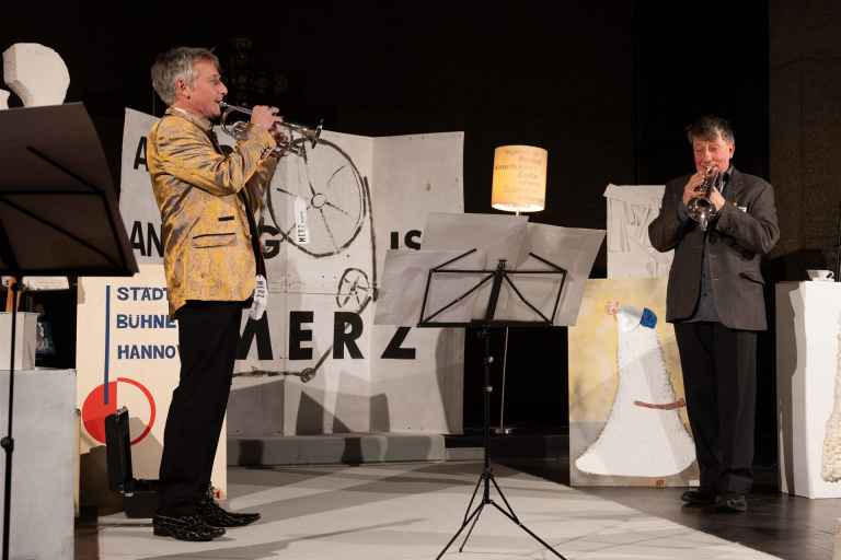 Das Duo Volker Pohlmann und Steffen Scheumann hat Kurt Schwitters MERZ-Kunst mit Musik, Texten, Tanz, Vortrag und Kunstwerken in unsere Martin-Luther-Kirche gebracht. Es war ein großartiger und - wie in der Ankündigung versprochen - absurd heiterer und liebevoll verstörender Abend.
