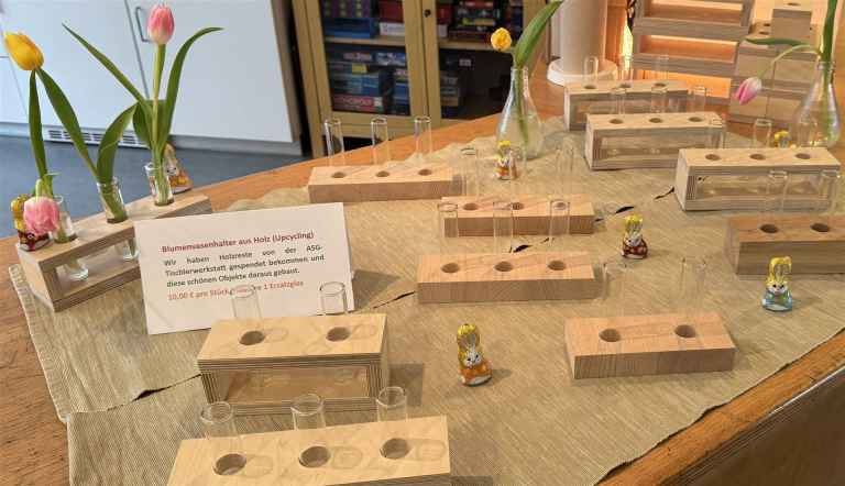 Aus dem Restholz, das die Jugendwerkstatt der ASG dem Jugendzentrum gespendet hat, sind Vasenhalter entstanden. +++ Auf dem letzten Weihnachts- und Frühlingsmarkt ist durch die Verkäufe das Geld für ein paar Tage auf Sylt für die beteiligten Jugendlichen zusammengekommen.