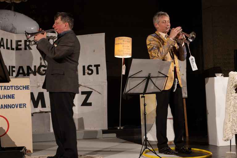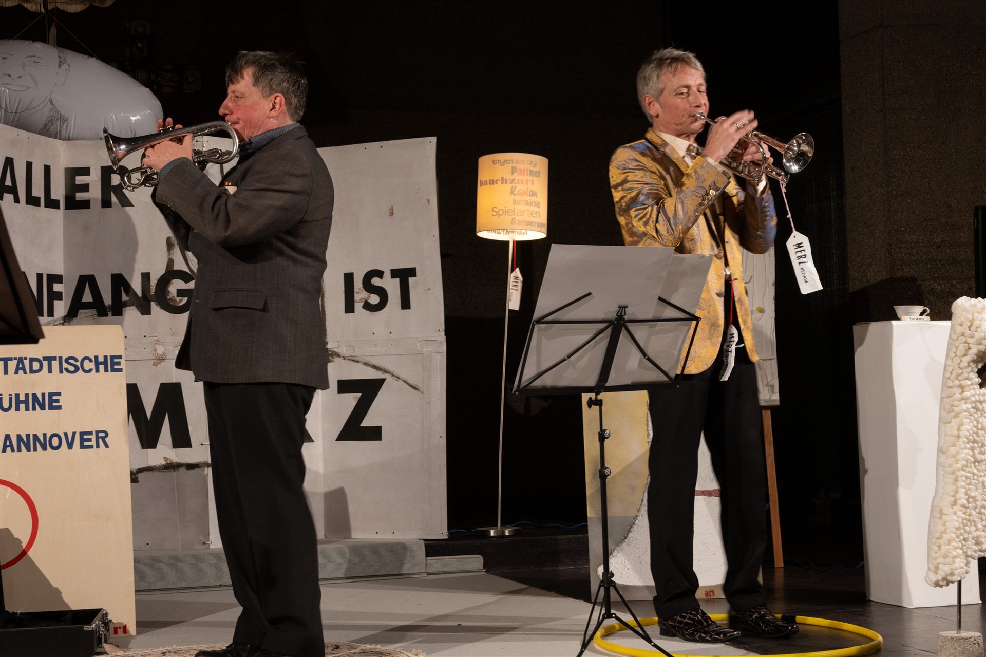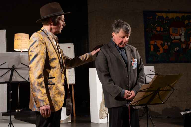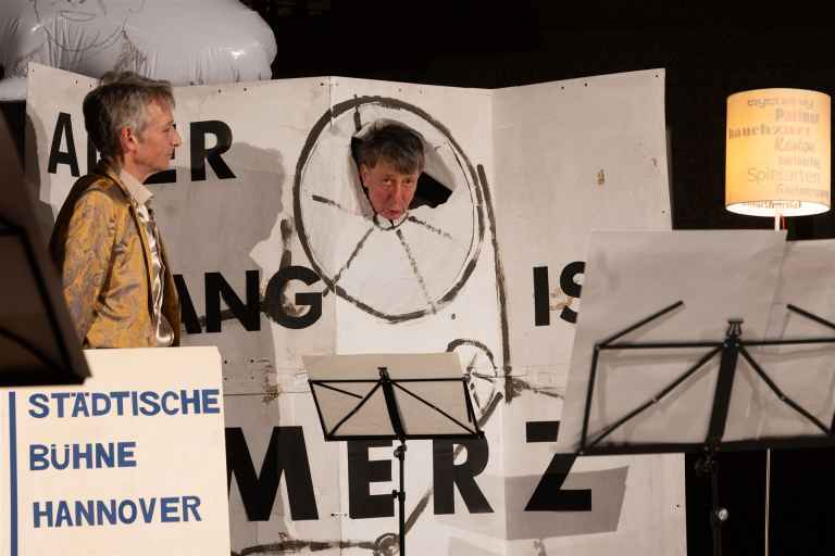 Das Duo Volker Pohlmann und Steffen Scheumann hat Kurt Schwitters MERZ-Kunst mit Musik, Texten, Tanz, Vortrag und Kunstwerken in unsere Martin-Luther-Kirche gebracht. Es war ein großartiger und - wie in der Ankündigung versprochen - absurd heiterer und liebevoll verstörender Abend.