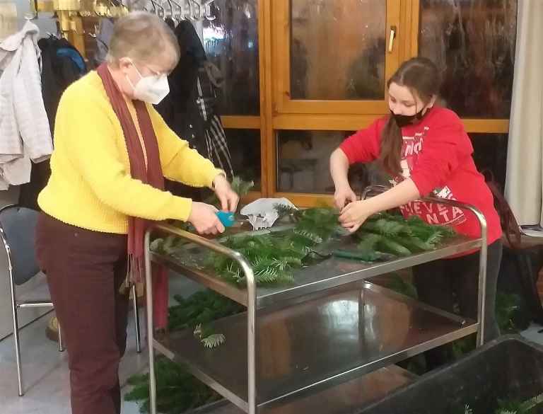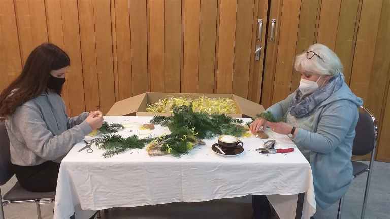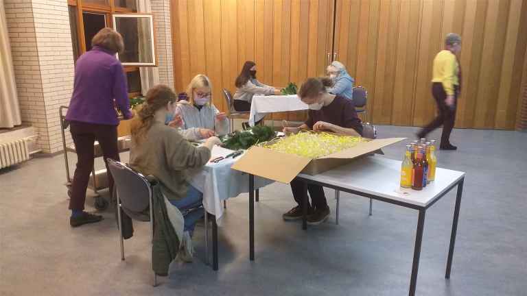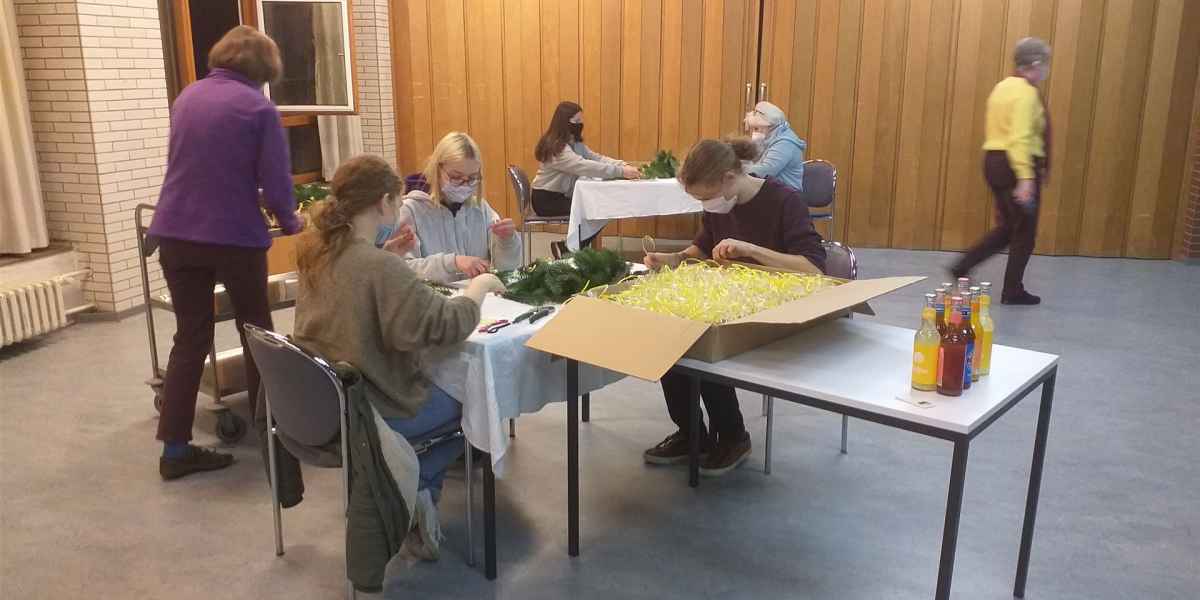 Beim Eintüten halfen unsere Konfirmand*innen zusammen mit weiteren ehrenamtlichen Helfer*-innen. Der Gemeindesaal wurde kurzfristig zur Weihnachtswerkstatt umfunktioniert und gemeinsam stellten wir - aufgeteilt auf unterschiedliche „Stationen“ - insgesamt 300 bunte Weihnachtsgruß-Tüten zusammen. Während dieses Nachmittags wurde fröhlich miteinander geplaudert, gelacht und endlich mal wieder Zeit miteinander verbracht.