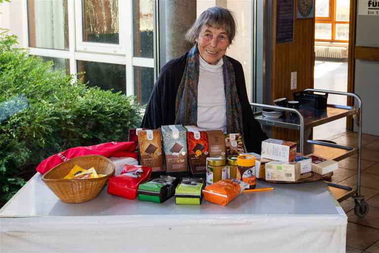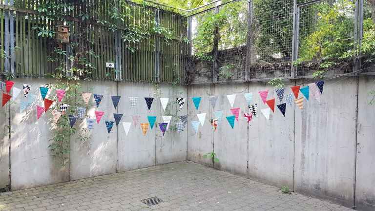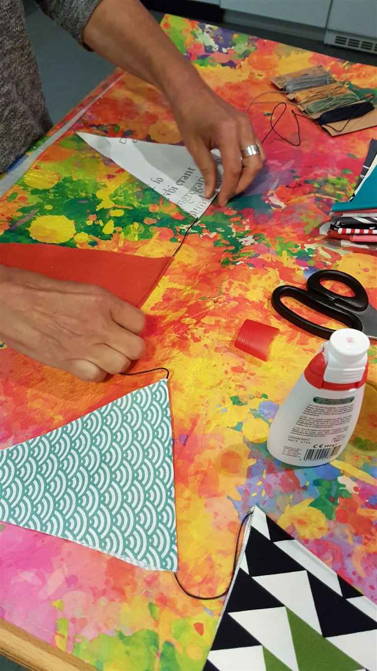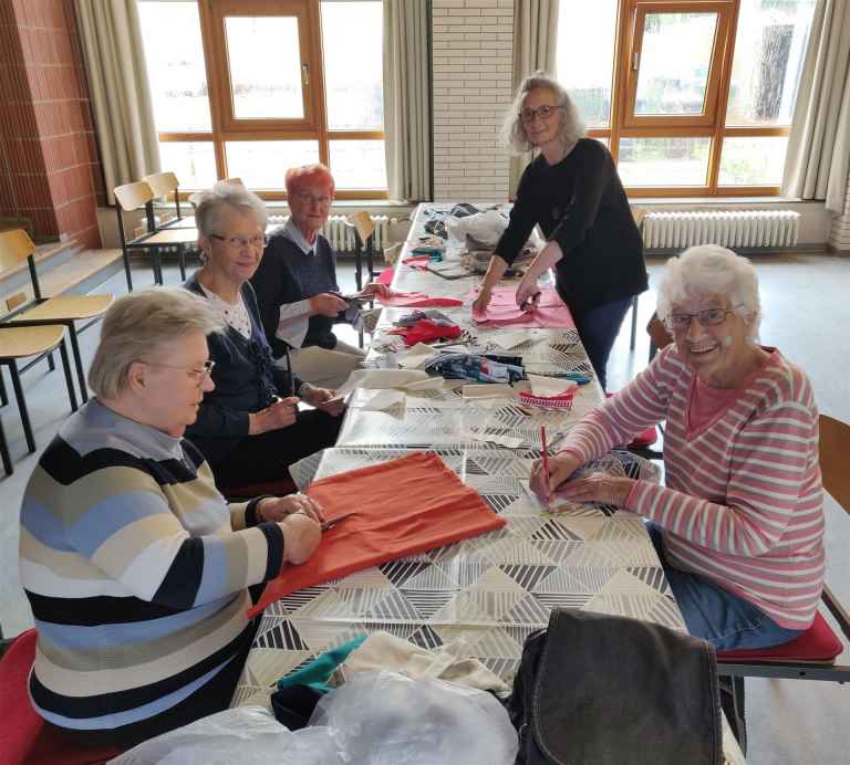 Die Idee war es, eine nachhaltige Wimpelkette selbst zu basteln. Eine Vorlage und ein paar Stoffreste waren im Jugendzentrum schnell zusammengesucht, fehlten noch fleißige Hände, die mitmachen würden. Die fand ich leider nicht im Jugendzentrum, dafür aber sehr schnell im Café Faire Bohne. Mit Stoffresten, Stift, Schere und guter Laune trafen wir uns, parallel zum Repair Café, im Gemeindesaal. In nur einer Stunde wurden 100 Wimpel aufgezeichnet und ausgeschnitten. Mit einer gelernten Schneiderin am Tisch gab es noch Extra-Tipps zum Stoffe falten! Für nächste kreative Ideen haben mir die Frauen ihre Unterstützung angeboten. Ganz herzlichen Dank dafür. Das Kleben fand dann im Jugendzentrum statt und fertig waren fünf Wimpelketten für Feste jeglicher Art.